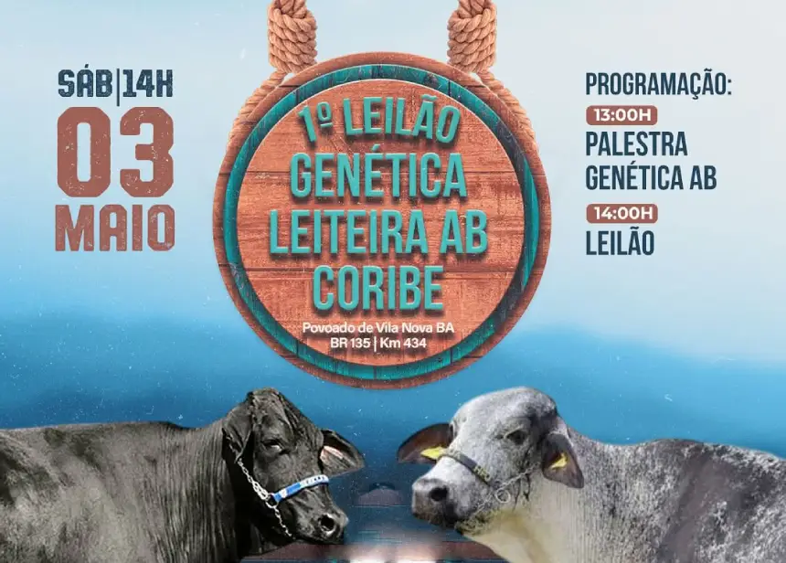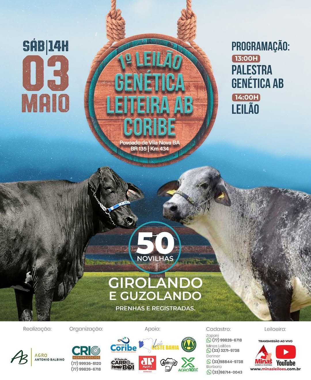 Prepare-se para um marco no agronegócio do Oeste da Bahia! No dia 3 de maio de 2025, às 14h, a cidade de Coribe sedia o 1º Leilão Genética Leiteira AB Coribe, um evento que promete elevar o padrão da bovinocultura de leite na região. Realizado na Vila Nova, Coribe-BA (BR 135, Km 434), o leilão oferecerá 50 novilhas Girolando e Guzolando, todas prenhas e registradas, com a chancela de qualidade da Agro Antônio Balbino, referência em genética leiteira.