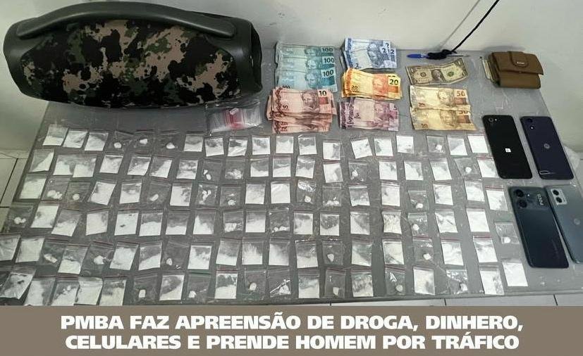 Na noite de ontem, sexta-feira (14), uma guarnição da 85ª CIPM apreendeu 117 papelotes de cocaína, aparelhos celulares e a quantia de R$ 755,00, além de prender em flagrante um homem por tráfico de drogas.