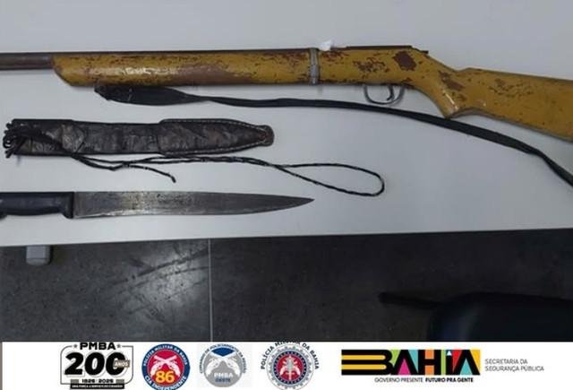 Diante das informações, a guarnição realizou a abordagem ao segundo envolvido, encontrando em sua posse uma espingarda artesanal do tipo “bate-bucha”, além de um facão.