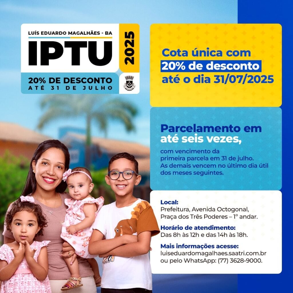 A Prefeitura de Luís Eduardo Magalhães, por meio da Secretaria da Fazenda, prorrogou, em caráter excepcional, o prazo para pagamento do Imposto sobre a Propriedade Predial e Territorial Urbana (IPTU) referente ao exercício de 2025.