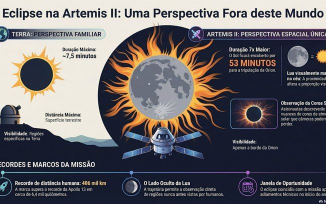 O eclipse solar total observado pela tripulação da Artemis II começa nesta segunda (6), por volta das 21h35 (horário de Brasília). O fenômeno deve ocorrer cerca de 90 minutos depois de a nave Orion atingir seu ponto mais distante da Terra, a aproximadamente 406 mil quilômetros. A marca supera em cerca de 6,4 mil quilômetros o recorde estabelecido pela missão Apollo 13, em 1970.