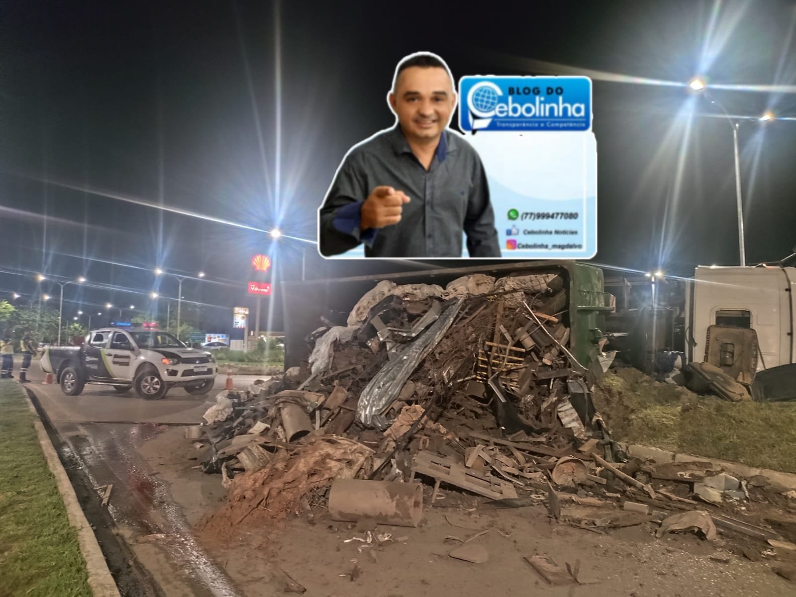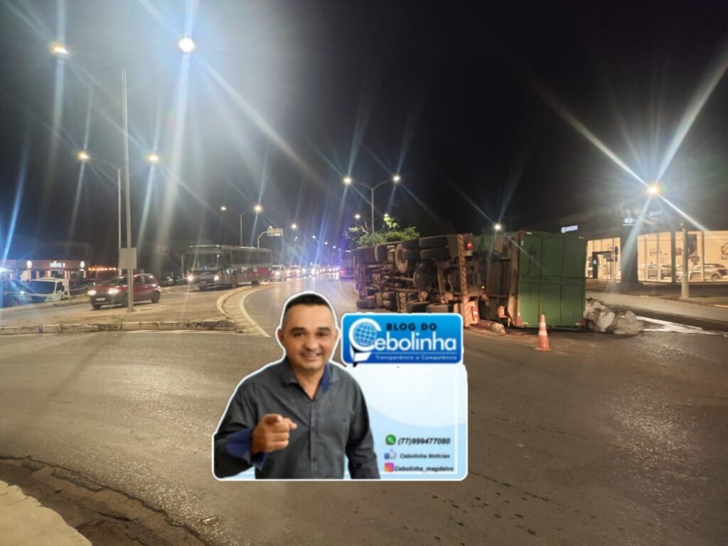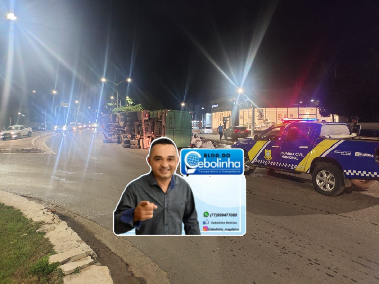 Por volta das 19hrs desta terça-feira, um caminhão truque carregado de reciclagem tombou na rotatória conhecida como rotatória do SABBÁ em Barreiras.