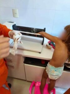 Ao chegarem ao local, os bombeiros encontraram uma menina de 3 anos com a mão esquerda presa entre os cilindros do equipamento. As equipes analisaram toda a estrutura e tentaram desmontar a parte que prendia o membro, mas sem sucesso. Devido à complexidade, foi necessário realizar um corte preciso no equipamento para liberar a criança com segurança.