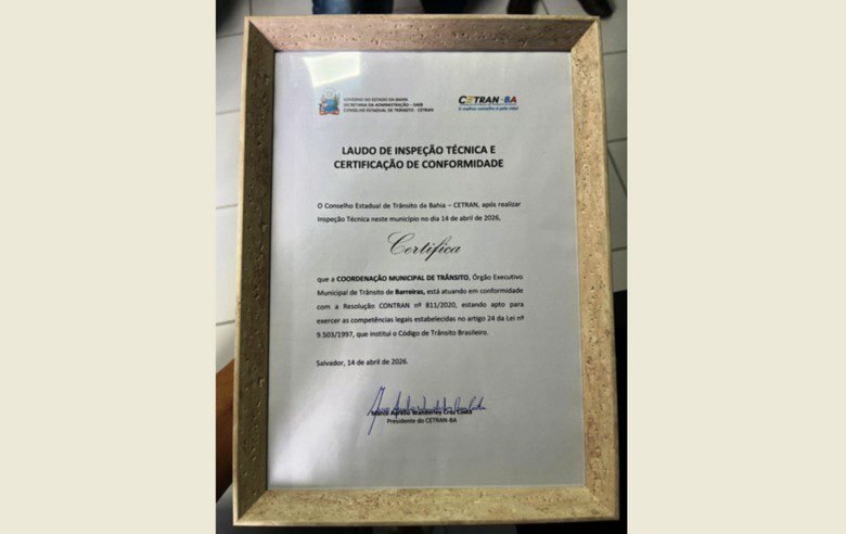 Como resultado da inspeção, Barreiras recebeu o laudo de inspeção técnica e certificação de conformidade, atestando que a Coordenação Municipal de Trânsito está atuando de acordo com a Resolução nº 811/2020 do Conselho Nacional de Trânsito (CONTRAN) e em conformidade com o Código de Trânsito Brasileiro.