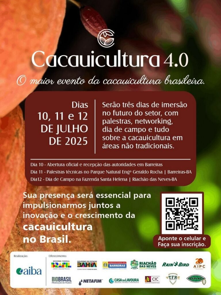 Barreiras será sede da quarta edição da Cacauicultura 4.0, maior evento técnico e institucional da cadeia produtiva do cacau no Brasil. De 10 a 12 de julho de 2025, o município receberá produtores, pesquisadores, técnicos, investidores e especialistas de todo o país — e também do exterior — para discutir os caminhos da cacauicultura moderna, com ênfase em tecnologia, mercado, rastreabilidade e sustentabilidade. O evento é realizado pela Associação de Agricultores e Irrigantes da Bahia (Aiba), com apoio da Prefeitura de Barreiras, e se estenderá também ao município vizinho de Riachão das Neves.