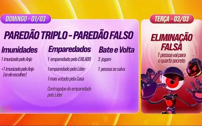 O primeiro paredão falso da edição será formado no domingo (01), onde o público irá votar para enviar um dos emparedados para o Quarto Secreto. A pessoa escolhida deixará a casa e ficará isolada, observando tudo sem contato com outros participantes e terá imunidade garantida ao voltar para a casa.