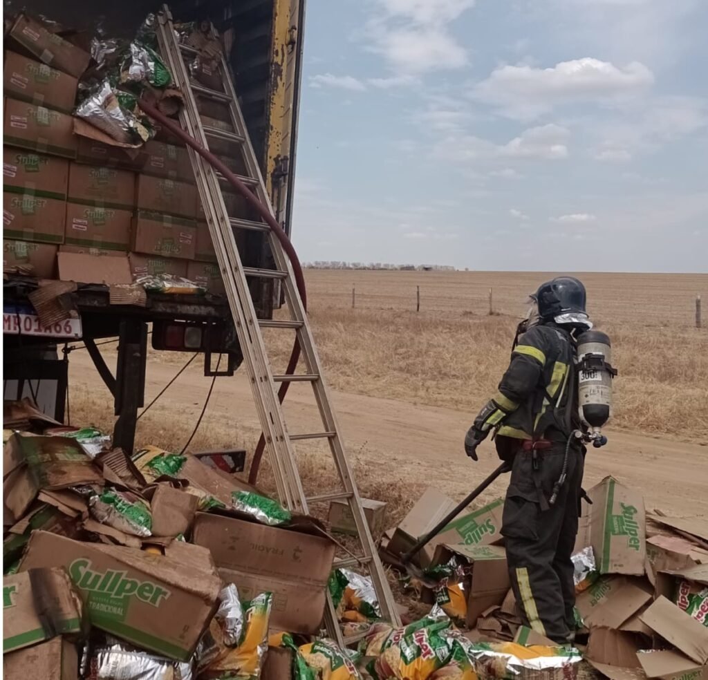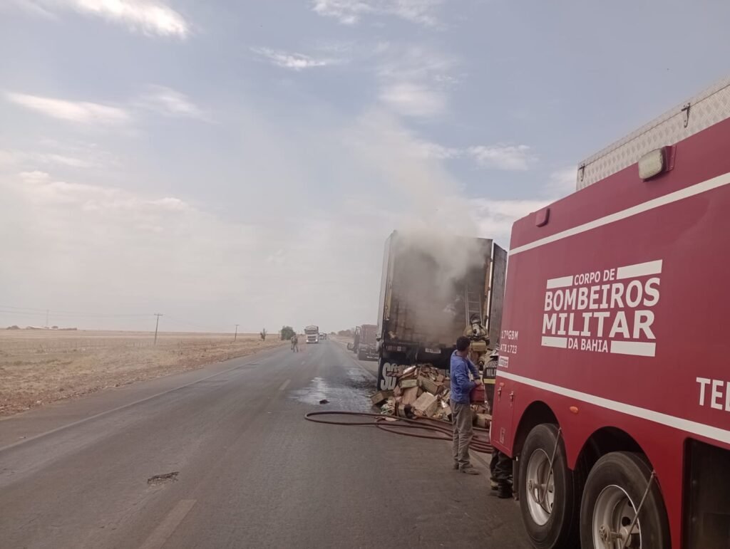 De acordo com informações, o veículo transportava batatinhas fritas acondicionadas em caixas de papelão. As chamas tiveram início no interior do baú e se espalharam rapidamente pelo material inflamável.