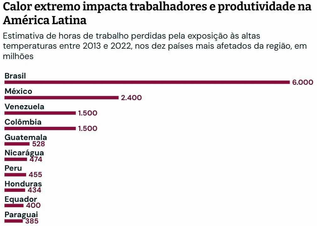 O Lancet Countdown, grupo de especialistas independentes que monitora os vínculos entre saúde e clima, descobriu que as altas temperaturas estão limitando a produtividade dos trabalhadores na América Latina, afetando sua saúde e sua fonte de renda. O resultado disso é o agravamento das crises econômicas enfrentadas em muitos países da região.