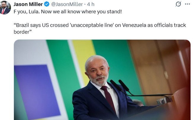 No X, Miller compartilhou uma reportagem que cita a reação de Lula nas redes sociais, em que o petista criticou a ação na Venezuela. Miller retrucou :