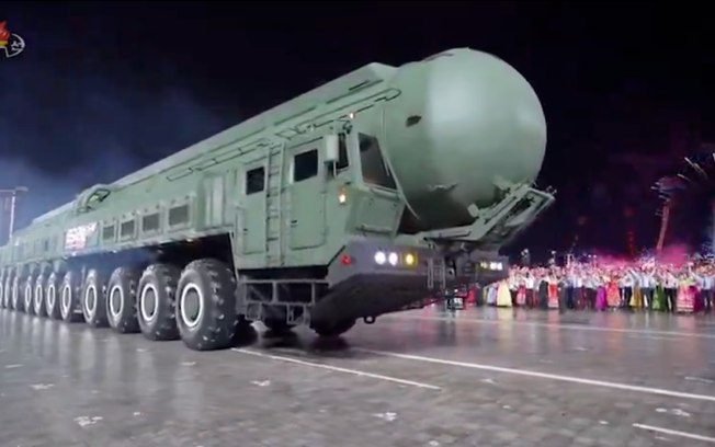 “A multidão irrompeu em aplausos entusiasmados quando uma coluna de ICBMs Hwasongpho-20, as armas nucleares estratégicas mais poderosas da Coreia do Norte, entrou na praça, ocupando toda a rota do desfile.”