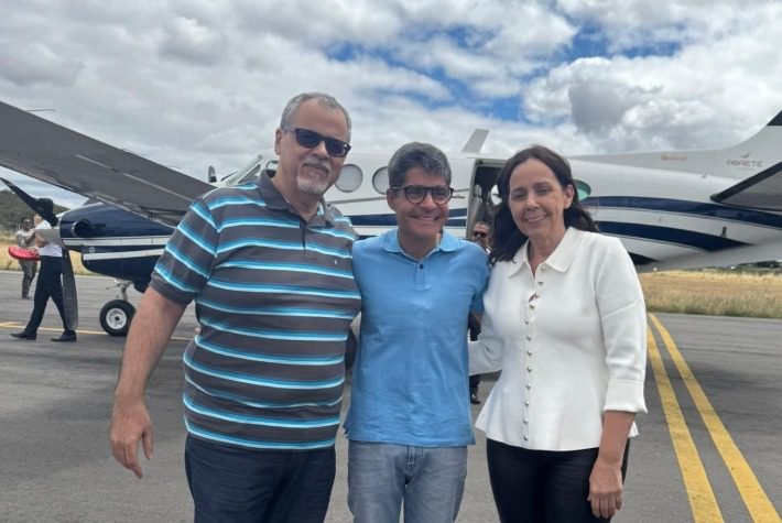 Em fotos publicadas pelo gestor em uma rede social, é possível ver que Neto chegou à cidade por meio de um jato particular.
