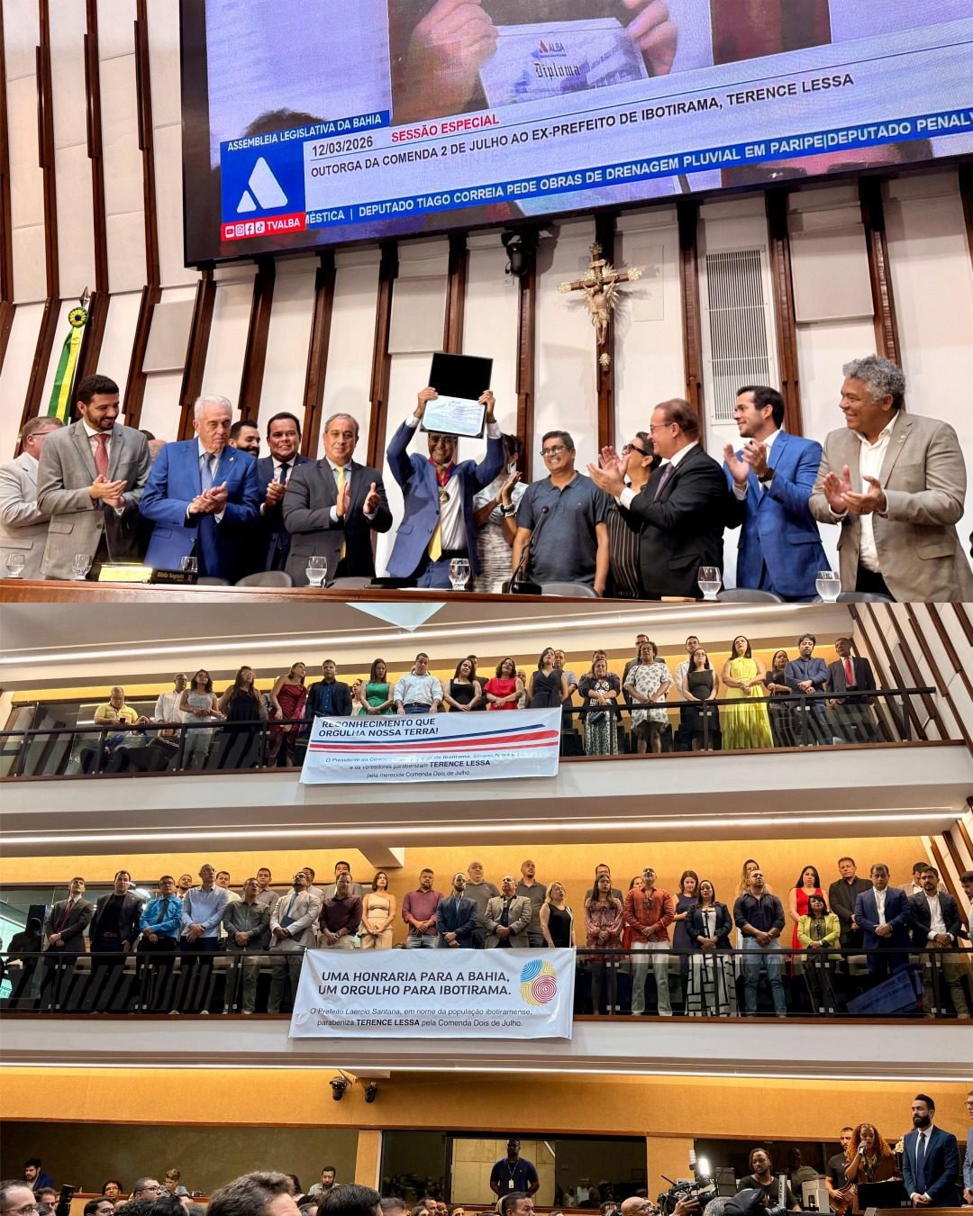 Considerada uma das mais altas honrarias concedidas pelo Parlamento baiano, a Comenda 2 de Julho reconhece personalidades que contribuem de forma significativa para o desenvolvimento do estado. Durante a solenidade, diversas autoridades destacaram a trajetória pública de Terence Lessa, marcada pela atuação política e pela defesa de pautas importantes para o interior da Bahia, especialmente para a região Oeste.