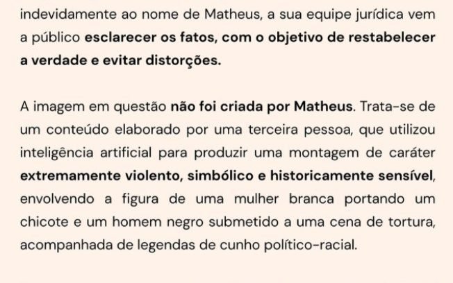 Em nota divulgada nesta segunda-feira (10), a defesa de Matheus afirma que não criou a imagem e reconheceu que a republicação foi um equívoco. Segundo advogados, o conteúdo foi produzido por terceiros e possui caráter violento e historicamente sensível.
