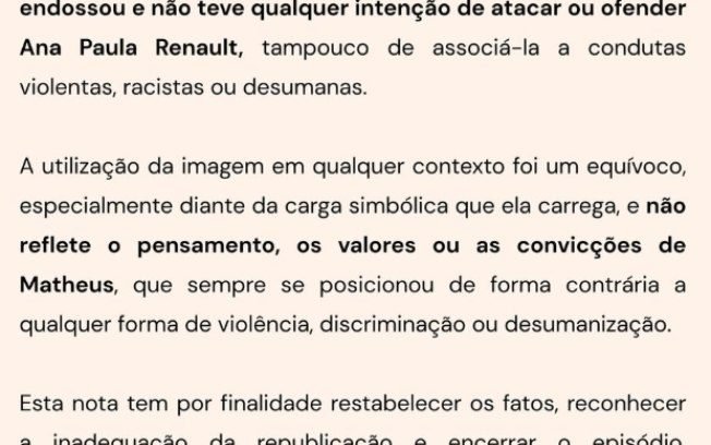 A equipe jurídica de Matheus Moreira se manifestou através de um post nas redes sociais após o ex-BBB receber uma notificação extrajudicial enviada por representantes de Ana Paula Renault.