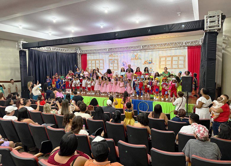 Na noite de quarta-feira (10), no Centro Cultural Rivelino Silva de Carvalho, a Educação Infantil de Barreiras viveu um momento especial com a culminância do projeto “O Mundo Mágico da Infância: Brincar, Sonhar e Sorrir”. O espetáculo, apresentado na forma de um musical, reuniu 220 crianças, com idades entre 3 e 6 anos, dos grupos Maternal 2, Pré-escola, Pré 1 e Pré 2 da Escola Municipal Major Cândido. Cada apresentação trouxe ao palco a leveza, a fantasia e a essência da infância, emocionando famílias, professores e toda a equipe escolar.