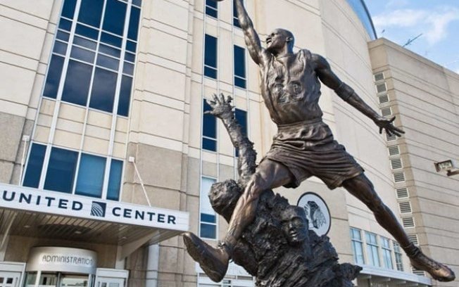 Michael Jordan: Lenda do basquete norte-americano e mundial, Michael Jordan tem uma estátua do lado de fora do United Center, casa do Chicago Bulls.