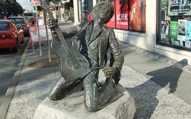 Jimi Hendri: O lendário guitarrista Jimi Hendrix — falecido em 1970 — tem esta estátua em Seattle, EUA, representando a energia de suas apresentações.