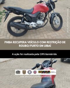Na tarde desta quinta-feira (20), uma guarnição da CIPE-Semiárido recuperou uma motocicleta furtada durante rondas no povoado de Boca D’água, em Uibaí, na região de Irecê. Os policiais patrulhavam