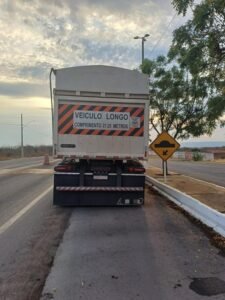 Documento obrigatório para transporte de carga excedente apresentava informação incompatível, levando à autuação e encaminhamento do caso à Polícia Civil. Durante a abordagem a um conjunto veicular de transporte de