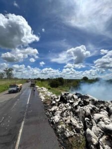 Na manhã desta quinta-feira (15), equipes da 2ª Companhia do 17º BBM foram acionadas para atender a uma ocorrência de incêndio em uma carreta carregada com algodão, às margens da BR-020, nas proximidades