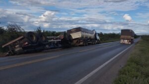 O compartimento de uma carreta tombou às margens da BR-242, na tarde de domingo (04), no trecho do Cipó, em Muquém do São Francisco, próximo ao entroncamento da estrada da Barra. Segundo informações