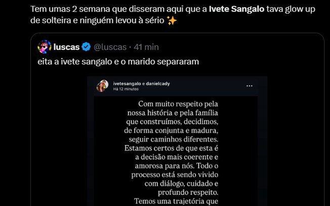 Também houve quem lembrasse que rumores já circulavam há semanas. Um internauta publicou: “Sempre que surgir um boato de separação aqui no Twitter: acreditem! Tem umas duas semanas que disseram que a Ivete tava glow up de solteira”.