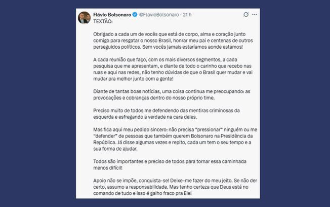 Em resposta ao pedido de pacificação feito por Flávio, Nikolas publicou um texto afirmando que vem sendo alvo de provocações há três anos e que, até agora, vinha se mantendo em silêncio.