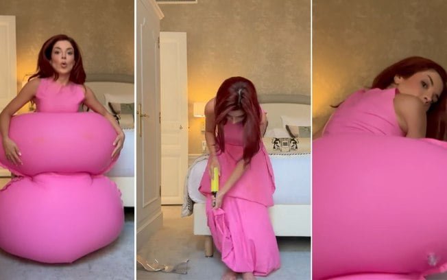 Em um vídeo publicado em suas redes, a influenciadora brincou com a situação ao mostrar que precisou inflar o vestido manualmente, já que a bateria do aparelho que acompanha a peça acabou descarregando.