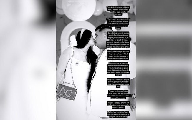 “Eu e a Nicole não estamos mais juntos. Após 11 meses de relacionamento, decidimos seguir caminhos diferentes. Foi uma decisão com respeito, carinho e a consciência de que, se for da vontade de Deus, nossos caminhos podem se cruzar novamente no futuro com a Nicole”, escreveu.