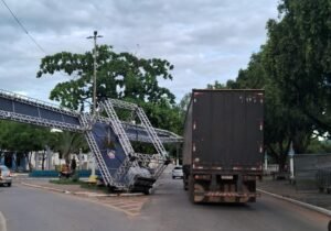 Com o impacto, o pórtico situado na Avenida Presidente Vargas, na Orla do Cais, foi parcialmente danificado, ficando o veículo preso à estrutura. A Secretaria de Segurança Cidadã e Trânsito agiu de imediato, autuando o motorista infrator e resguardando o perímetro para as medidas necessárias.