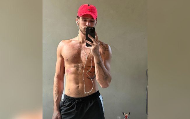 Mesmo com a temperatura marcando apenas 12°C, o ator dispensou a camisa e fez uma selfie no espelho, destacando o peitoral definido, braços torneados e abdômen sarado.