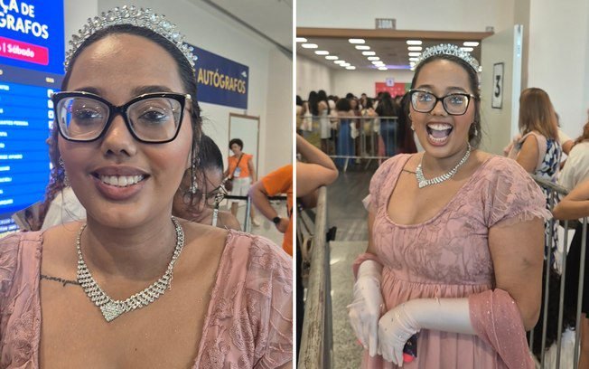“Eu já conhecia e tinha os livros mesmo antes do começo da série. Eu não sou daqui de Salvador, sou do Ceará, já estava com passagem comprada, vestida, encomendada para ver Julia Quinn. Não consegui o ingresso para sessão de autógrafos, mas então mesmo sem senha, eu falei, vou lá, vou tentar ver o que a gente consegue. A minha personagem favorita é a Katie, mas as fotos mais usadas são de referência a Daphne, a primeira diamante da temporada.”