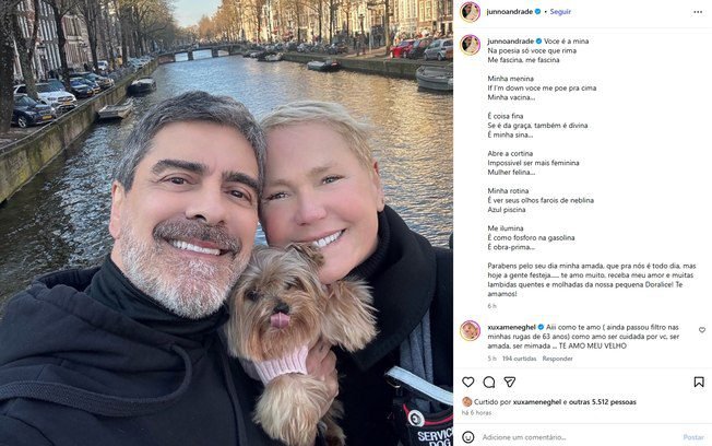 Ilustrando o momento, Junno compartilhou um clique descontraído do casal durante uma viagem recente. Na foto, os dois aparecem sorridentes e agarradinhos, acompanhados da cachorrinha da família, Doralice. Mas o que realmente chamou a atenção foi o poema que Junno publicou junto com a foto.