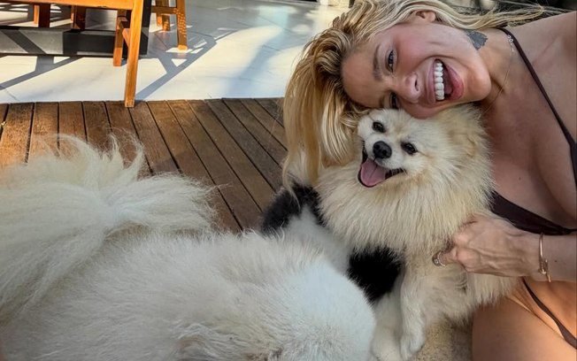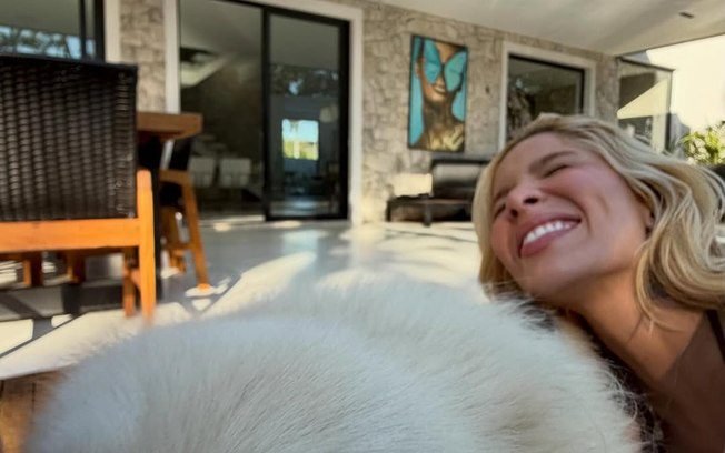 Nas fotos, o casal aparece com looks em tons de marrom. Karoline Lima usa biquíni na mesma paleta, enquanto Léo Pereira aparece apenas de bermuda. Dois cachorros também surgem nos registros ao lado da influenciadora.