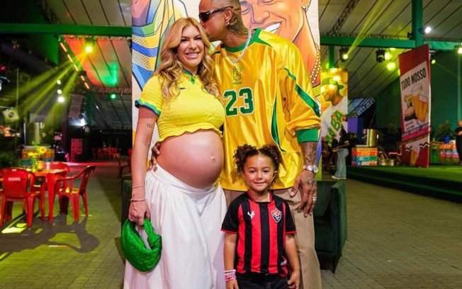 Ao lado da esposa, Lore Improta, que está grávida do segundo filho do casal, e da filha primogênita, Liz, de 4 anos, o cantor posou em registros que mostram a proposta informal do evento. Os looks da família, inspirados em times de futebol, também se destacaram entre os seguidores.