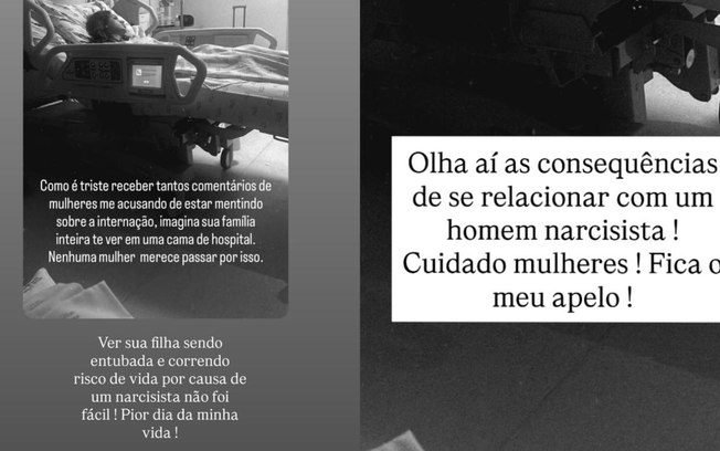Daniele Aguiar publicou uma imagem da filha hospitalizada, relembrando um período delicado vivido após o fim do relacionamento. “Ver sua filha sendo entubada e correndo risco de vida por causa de um narcisista não foi fácil! Pior dia da minha vida!”, escreveu.