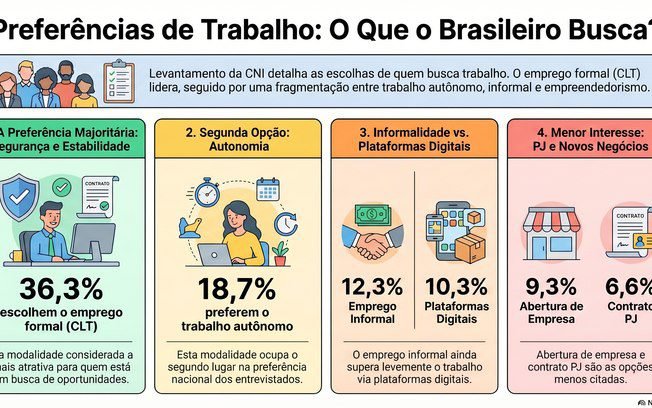 Ainda segundo o estudo, o trabalho autônomo foi apontado como a segunda opção mais atrativa pelos participantes, contabilizando 18,7%. Em seguida, estão o emprego informal (12,3%), trabalho autônomo por meio de plataformas digitais (10,3%), abertura do próprio negócio (9,3%) e contrato como pessoa jurídica – PJ (6,6%).
