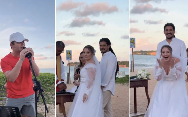 Sem ser notado inicialmente, ele se sentou na areia próximo ao altar e esperou o momento certo para entrar em cena. Quando o casal, de costas para os convidados enquanto assinava os papéis do casamento civil, ouviu a voz de Matheus no microfone, a reação foi imediata.