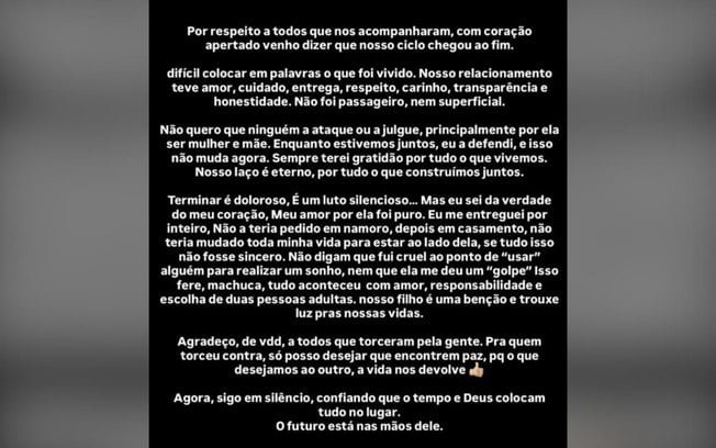 “Terminar é doloroso, é um luto silencioso… mas eu sei da verdade do meu coração, meu amor por ela foi puro. Eu me entreguei por inteiro, não a teria pedido em namoro, depois em casamento, não teria mudado toda minha vida para estar ao lado dela, se tudo isso não fosse sincero. Não diga que fui cruel ponto de “usar” alguém para realizar um sonho, nem que ela me deu um “golpe”. Isso fere, machuca, tudo acontece com amor, responsabilidade e escolha de duas pessoas adultas. Nosso filho é uma benção e trouxe luz para nossas vidas.”