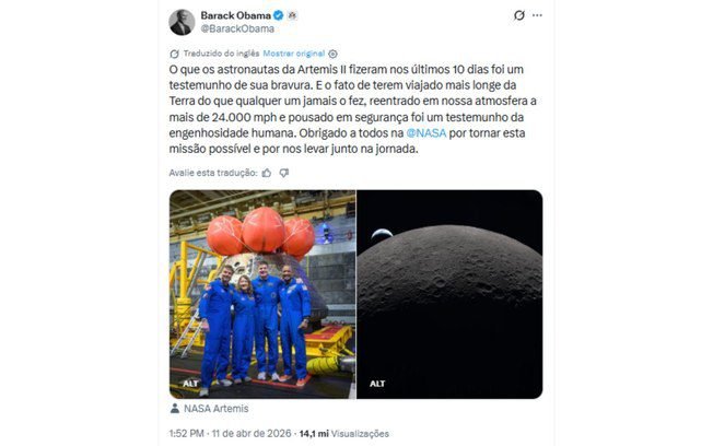 O ex-presidente dos Estados Unidos Barack Obama elogiou nas redes sociais o sucesso da missão Artemis II e a coragem dos astronautas envolvidos. No texto, ele falou da façanha histórica alcançada ao longo de dez dias de missão, ressaltando tanto o desempenho da tripulação quanto o avanço tecnológico representado pela operação.