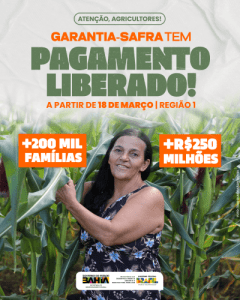 Já pode ficar de olho! Começa dia 18 de março, terça-feira, o pagamento do Seguro Safra para mais de 214 mil agricultores familiares baianos dos territórios da Região 1, que aderiram ao programa na safra 2023/2024 e sofreram perdas de safra no verão e inverno baianos. Este ano, as mulheres são maioria: 54% do público beneficiado. Cada família receberá R$ 1.200,00, totalizando cerca de R$ 257 milhões em recursos.