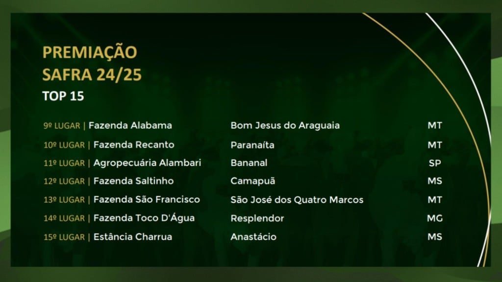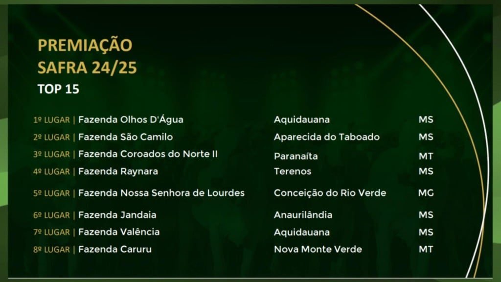 A Fazenda Olhos D’Água, de Aquidauana, no estado de Mato Grosso do Sul, conquistou o primeiro lugar geral, consolidando-se como o grande destaque da safra.