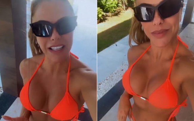 A influenciadora digital Poliana Rocha, de 48 anos, chamou atenção nas redes sociais neste domingo (15) ao aparecer de biquíni enquanto molhava as plantas. A influenciadora, casada com o cantor Leonardo, de 61, contou que escolheu o look para aproveitar o sol na fazenda onde mora, em Goiás.