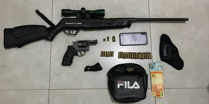 Ao chegarem ao local indicado, os agentes encontraram Luciano Viana da Silva, que portava uma carabina calibre .22. No momento da abordagem, ele tentou se desfazer da arma, mas foi detido. Durante a varredura na área, os policiais localizaram um segundo suspeito, José Antônio Martins de Souza, que tentou fugir, mas foi alcançado e revistado.
