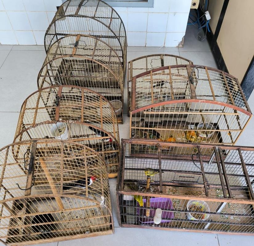 Questionado sobre as licenças ambientais para criação dos animais, o suspeito afirmou que não possuía autorização. Com consentimento do morador, a guarnição adentrou a residência e constatou a presença de sete gaiolas contendo as seguintes espécies: dois canários-da-terra, dois papa-capins, um azulão e um sabiá — todas aves nativas da fauna brasileira, cuja criação é regulamentada por legislação ambiental.