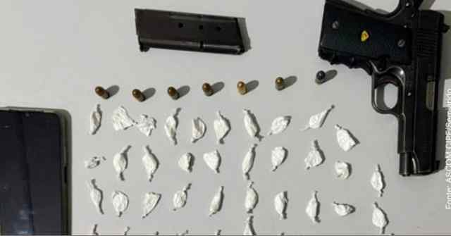 Os militares realizavam patrulhamento na região, quando visualizaram um indivíduo a bordo de uma motocicleta, trafegando em alta velocidade. Ao avistar as guarnições, o suspeito tentou fugir, sendo alcançado. Com ele foi encontrada, uma pistola calibre 380 com munições e 49 porções de cocaína.