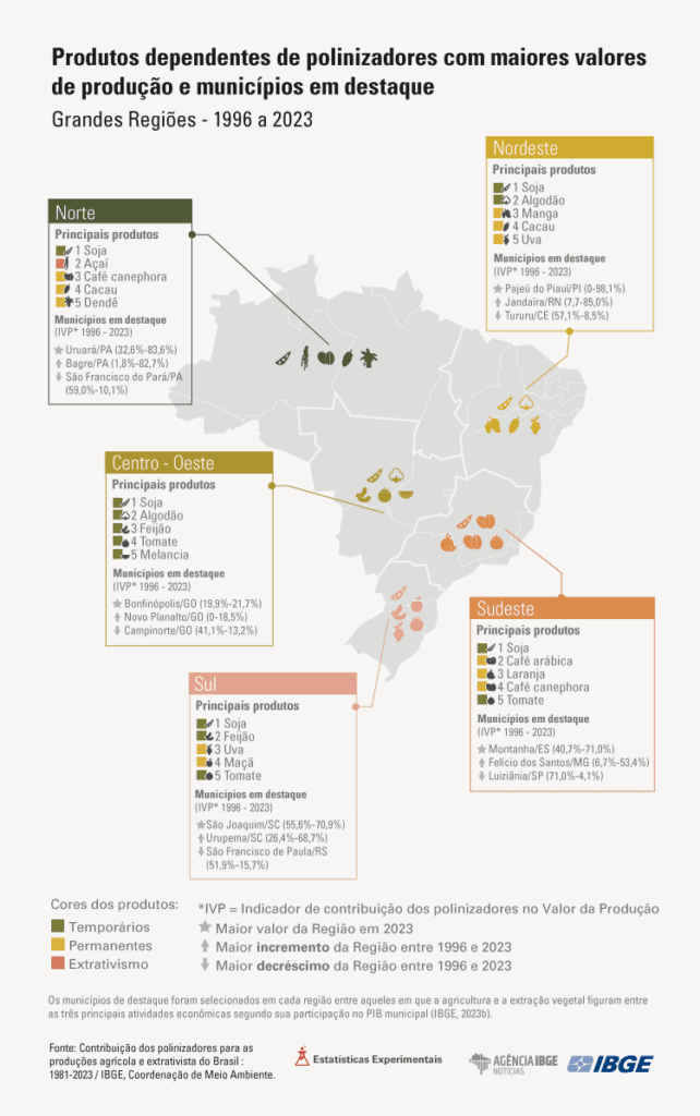 Dos 89 produtos analisados, 48,3% têm algum grau de dependência da polinização animal. O efeito é mais acentuado nas culturas permanentes, como frutas e café, e no extrativismo vegetal, com destaque para o açaí e o babaçu.