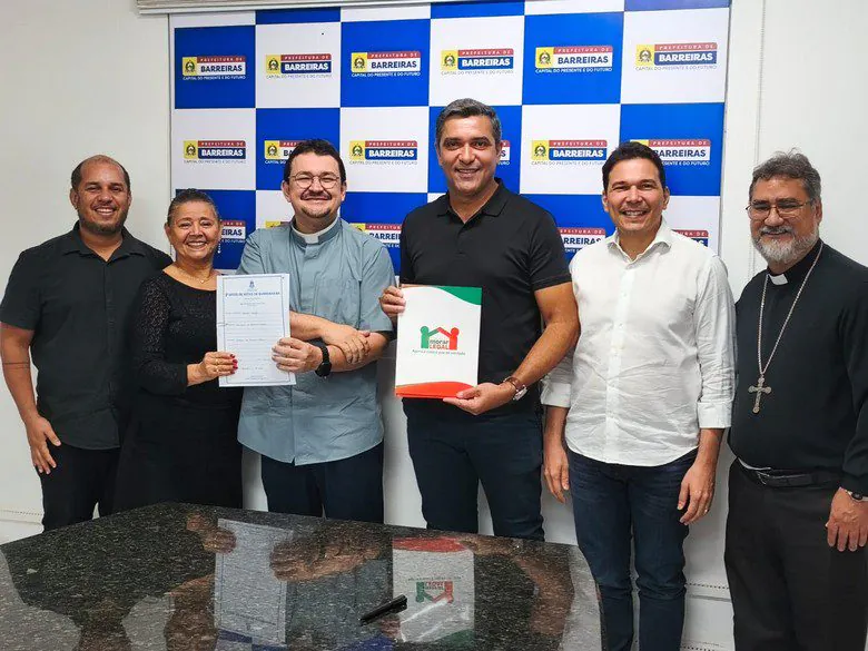 Nesta quinta-feira (22), o prefeito Otoniel Teixeira oficializou a entrega da escritura de doação do terreno da Igreja Nossa Senhora de Fátima do bairro Flamengo à Diocese de Barreiras. O ato, que aconteceu na sala de reuniões do Gabinete, garante segurança jurídica ao espaço religioso, aos fiéis e à Diocese. A cerimônia contou com a presença do vice-prefeito e procurador-geral do Município, Túlio Viana; do Bispo Diocesano, Dom Moacir Silva Arantes; do padre Jocleilson Sebastião; do assessor jurídico Gladiston Rocha; da assessora do Gabinete, Lurdinha Pessoa e da tabeliã Mariene Rosa.