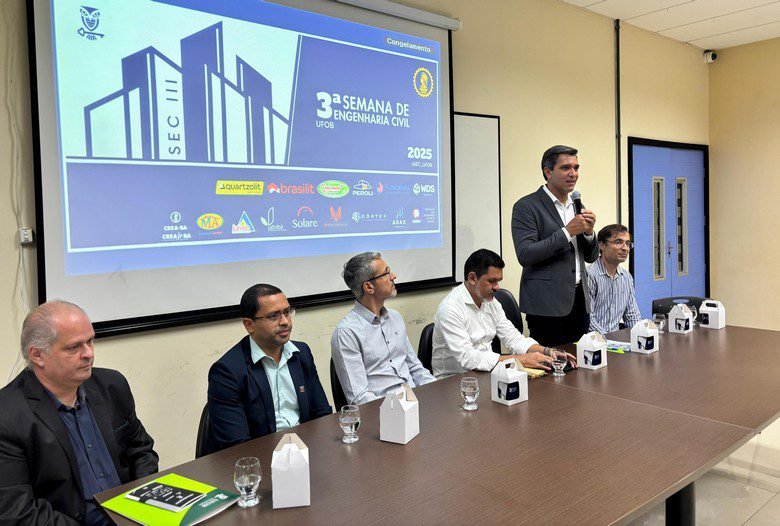 O prefeito de Barreiras, Otoniel Teixeira, participou na noite desta segunda-feira (12) da cerimônia de abertura da 3ª Semana de Engenharia Civil da Universidade Federal do Oeste da Bahia (UFOB). Realizado no Campus Reitor Edgard Santos, o evento reúne estudantes, professores e profissionais da área em uma programação intensa até o próximo sábado (17), com minicursos, palestras, treinamentos e visitas técnicas, entre elas à obra do edifício Soft Residence, no bairro Parque das Águas.