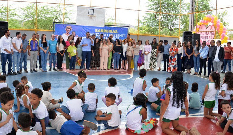 A comunidade escolar do Conjunto Habitacional Rio Grande celebrou, nesta quarta-feira (22), a entrega da obra de cobertura e requalificação da quadra poliesportiva, assim como o calçamento e jardinagem do pátio da Escola Municipal Paulo Freire. O novo espaço foi oficialmente inaugurado em uma solenidade que reuniu o prefeito Otoniel Teixeira, o secretário de Educação, Jeferson Barbosa, o ex-prefeito de Barreiras, Zito Barbosa, a diretora da unidade escolar, Alessandra Santos, além dos vereadores Zé do Sorvete, Tatico Rocha, Valdimiro José, Thaislane Sabel, Dicíola Baqueiro e Delma Pedra. Servidores da educação, secretários e subsecretários municipais também prestigiaram o momento.
